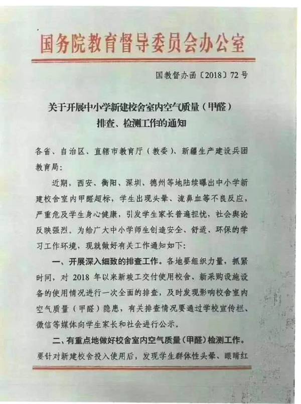在今年九月份開學(xué)期間,西安、衡陽、深圳、德州等地陸續(xù)曝出中小學(xué)新建校舍室內(nèi)甲醛超標(biāo),學(xué)生出現(xiàn)頭暈、流鼻血等不良反應(yīng),嚴(yán)重危及學(xué)生身心健康,引發(fā)學(xué)生家長普遍擔(dān)憂,社會輿論反映強(qiáng)烈。為給廣大中小學(xué)師生創(chuàng)造、舒適、的學(xué)習(xí)工作環(huán)境,2018年9月21日,國務(wù)院教育督導(dǎo)委員辦公室發(fā)布了《關(guān)于開展中小學(xué)新建校舍室內(nèi)空氣質(zhì)量(甲醛)排...